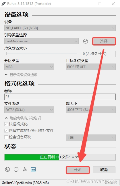 Rufus界面,设置【分区类型】选择MBR,【目标系统类型】选择BIOS或UEFI。