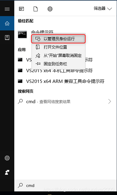 1、在搜索中输入cmd,右击图标以管理员身份运行。