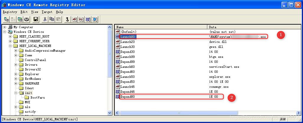 5、 在注册表HKEY_LOCAL_MACHINE\init\目录下增加Launch80与Depend80表项。Launch80与Depend80键名后的80指的是启动顺序,一般情况下,该数值越大启动越靠后。NAND表示SD卡盘符。说明:Depend80值1E 00用来设置依赖程序,若你的应用程序不依赖于其它程序,这句可以不加。