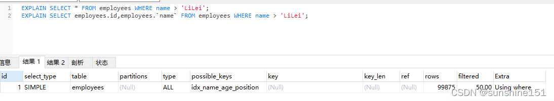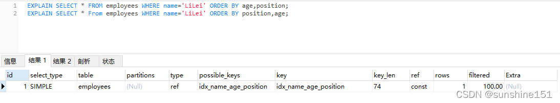 结果2中有个using filesort,所以是没有走索引的,效率比较低