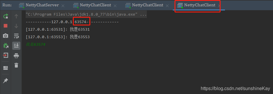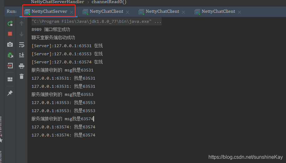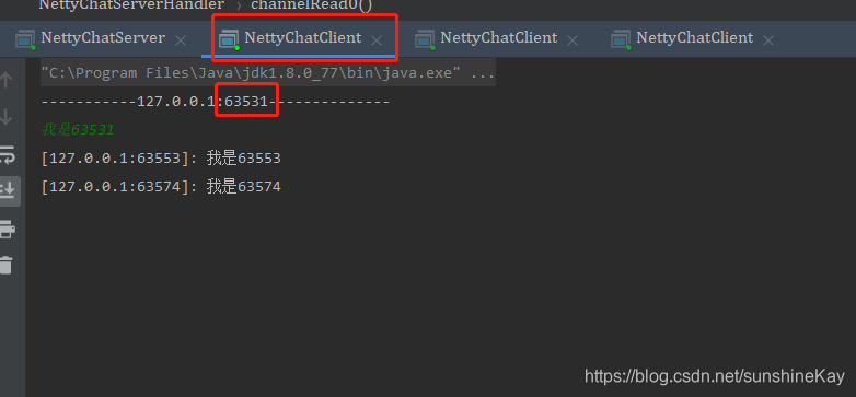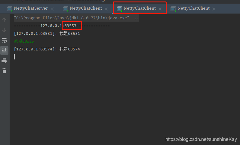 测试验证:启动NettyChatServer服务端,启动多个客户端NettyChatClient,在客户端控制台进行消息发送