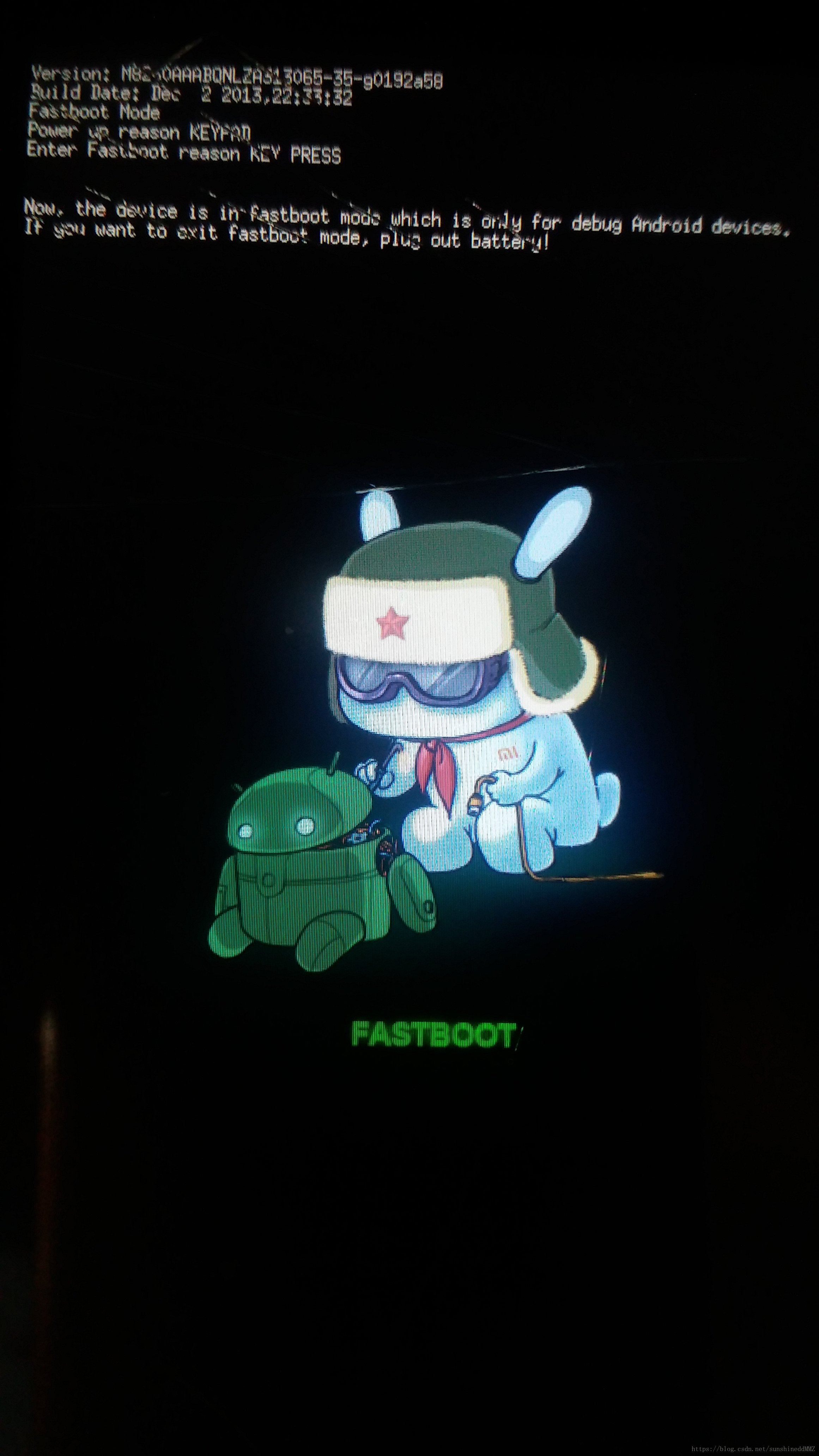 1.1手机用原装数据线连接电脑并关机,同时按住电源键和音量下键 + 米键直至出现fastboot模式。(不同手机型号进入fastboot方式不同,自行查阅了解), 或者在手机正常开机模式下使用如下终端命令进入: