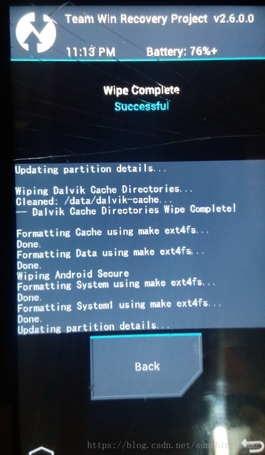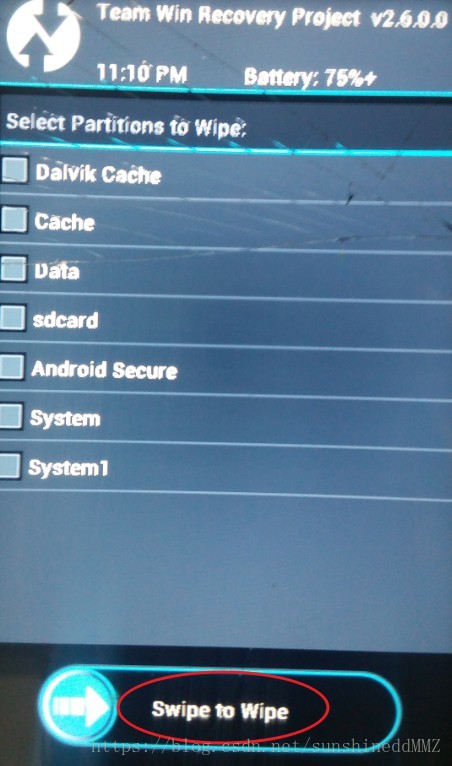 fastboot boot xxx.img 1.6这时手机应该也有twrp启动的画面,我这里选Wipe(擦除数据)–>Advanced wipe(高级擦除),把需要擦除的打勾,USB的话不需要勾选,注意sdcard为内存卡,如果卡刷的话,不要打勾。 选好后,滑动滑块双清,成功后会显示 wipe complete,然后back返回主菜单。