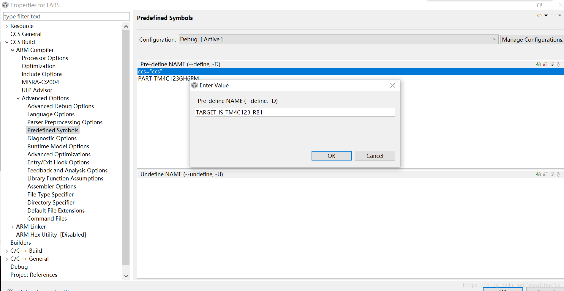 着实头疼了一番,查了好多处理CCS6报错unresolved symbols remain的解决办法,但是这个ROM_XXXXXX之类的依旧没有解决,最后终于找到了原因啊,是因为这些符号是在中TivaWare rom.h包含用于选择Tiva ROM中的可用功能,而CCS6中报错是因为这些未定义的符号没有TARGET_ <device_family> _ <ROM_version>预定义符号,所以想解决这个问题,就需要将这个预定义符号TARGET_IS_TM4C123_RB1添加到编辑器的选项中。
