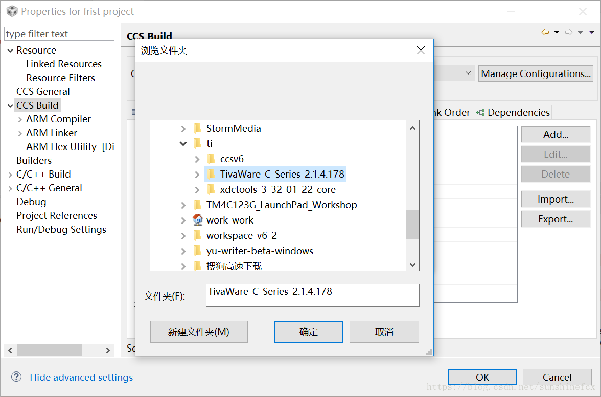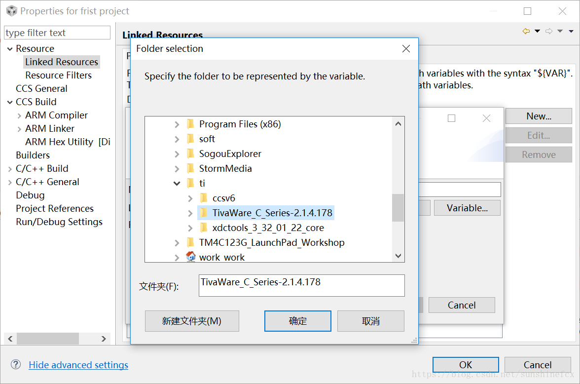找到第一步的时候安装的“Tiva Ware的安装目录”,选中后点击“确定”即可添加完成: