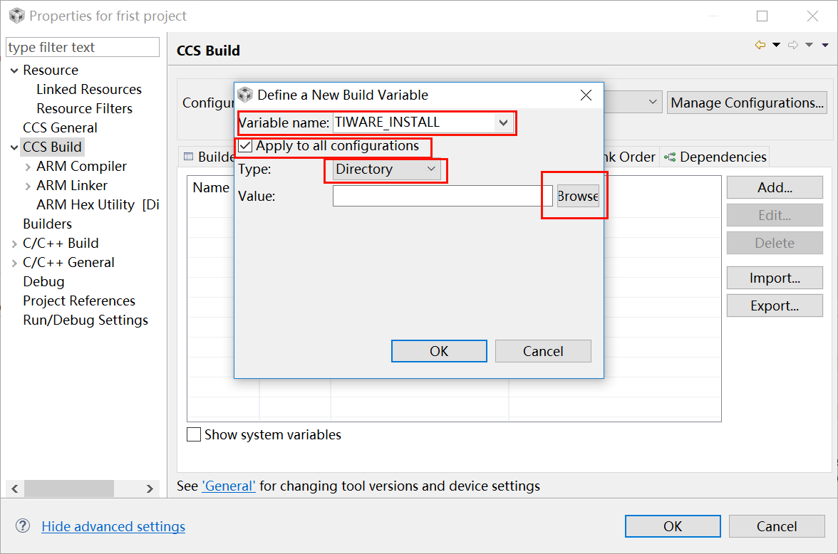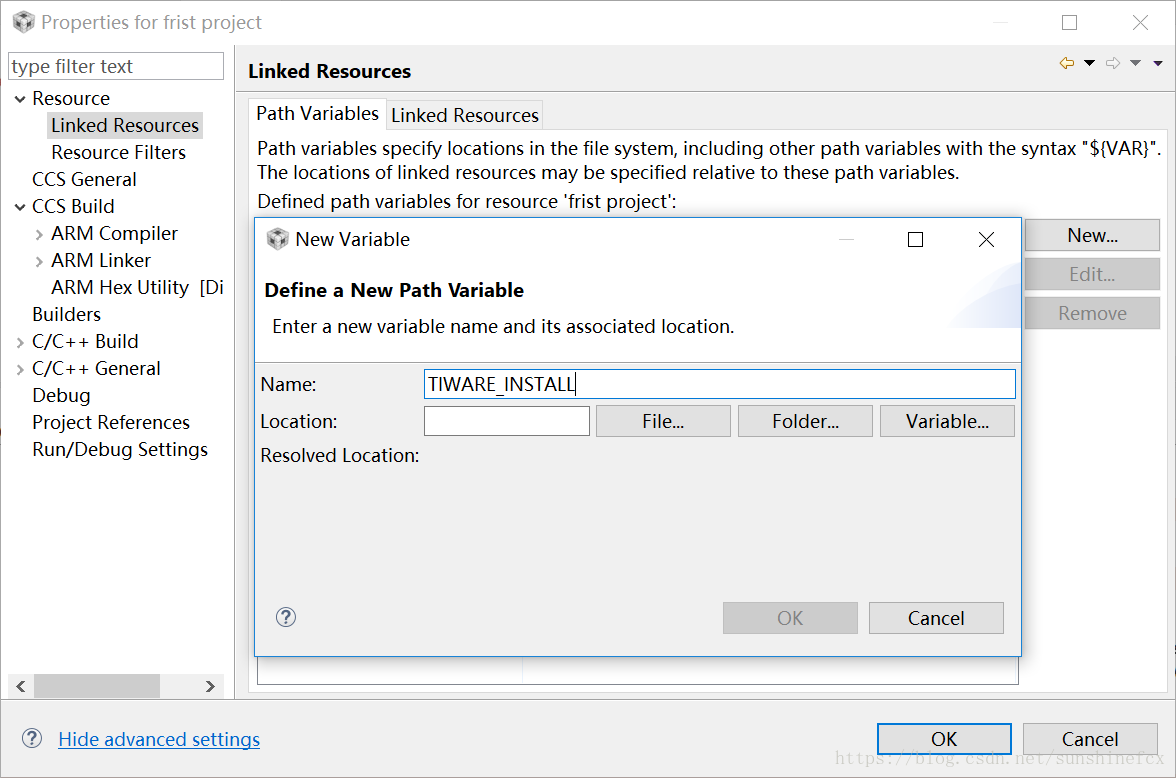 1、为这个变量起名字,注意,这个名字一定和上一步Path Variables中创建的变量同一个,即“TIWARE_INSTALL”