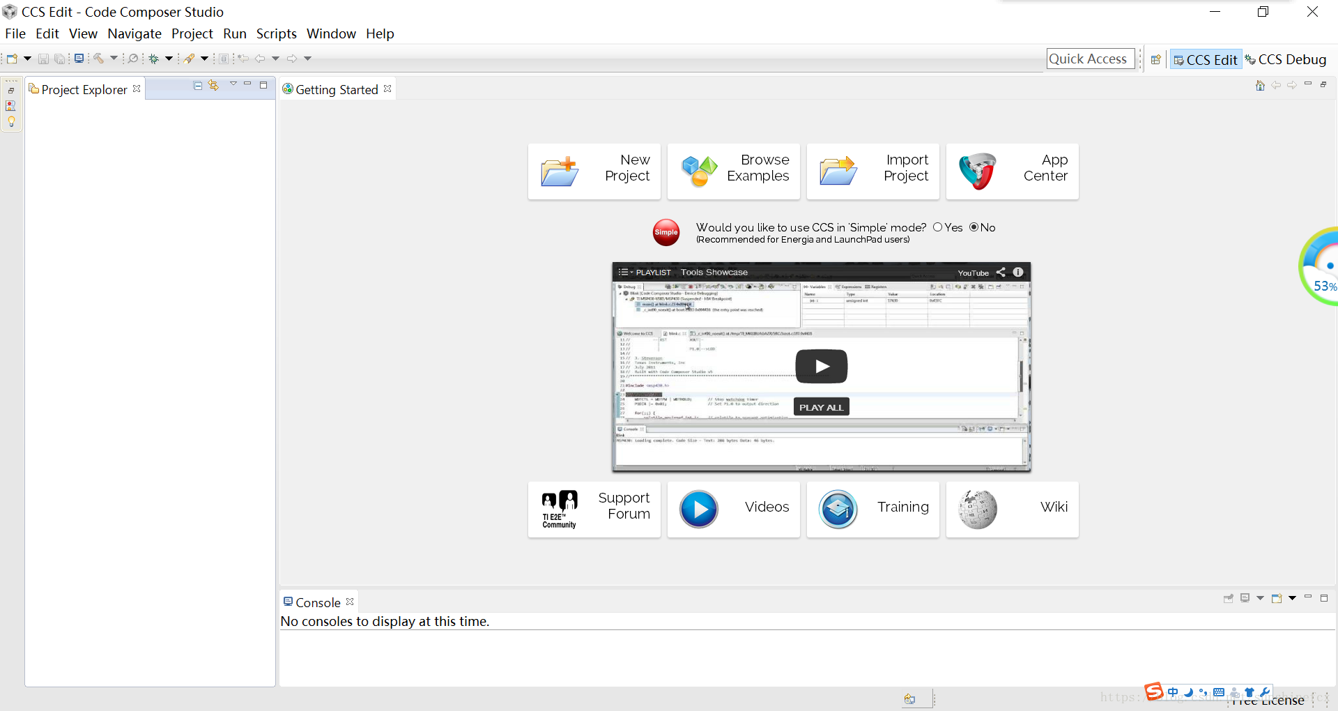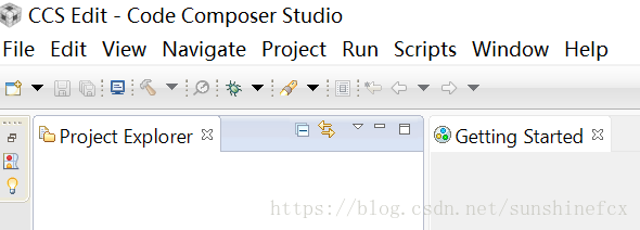 刚开始的时候会让你选择工作空间,也就是你的程序以后保存的位置,自己找一个文件夹就可以啦,但是注意,别在中文路径下面,不然会报错的,打开CCS后的界面是这样的: