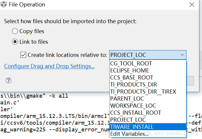 选择“Link to files”,然后选择我们前几步操作中添加的那个变量,这个变量一定是前面添加的Path Variables和Build Variables的变量名,点击“OK”后就将库文件添加到了整个工程中