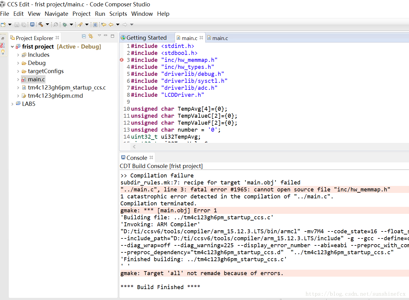 创建好工程后,如果我们直接在main.c中写程序,然后点击编译的话,是会报错的,如下图所示: