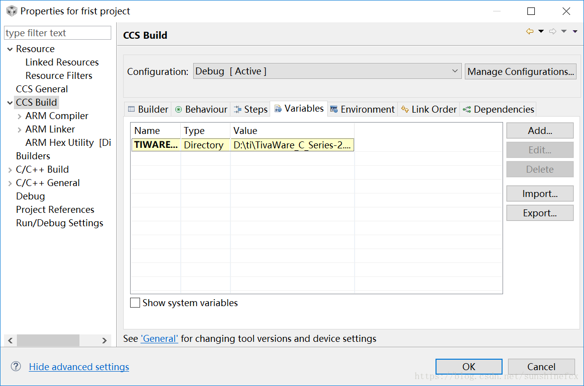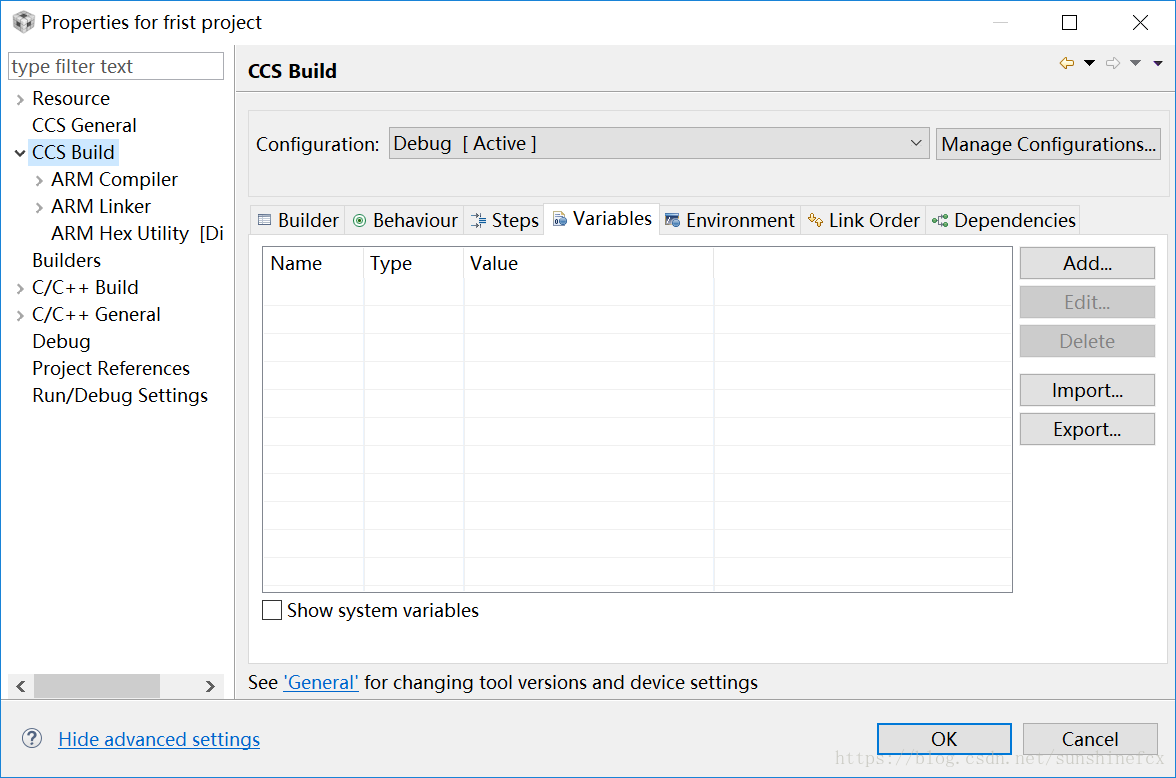 点击 CCS Build→ Variables,出现如下界面,可以发现,这个菜单栏下面是空的,然后我们点击右边的“Add”