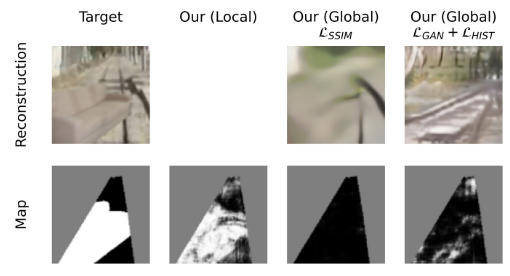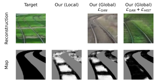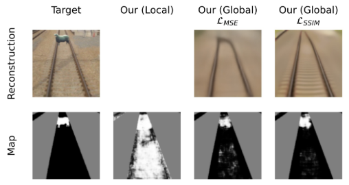 虽然总体上我们的方法显著超越基线,但局部方法与全局方法之间的性能差距较小。全局方法(基于 LGAN + LHIST 的版本)取得了最高 AUROC(0.936),而局部方法在 F1 分数上表现更佳,说明其在障碍物定位方面更稳健。我们进一步分析了不同损失函数下全局方法的表现(如下图):LMSE 和 LSSIM 的生成模型主要关注像素级颜色差异,而非语义差异,因此容易将小障碍物“错误地重建出来”,导致漏检。基于 GAN 的方法(LGAN 和 LGAN + LHIST) 能够同时关注语义与视觉信息,从而在罕见或复杂场景中表现更好,减少了误报(false positives)。