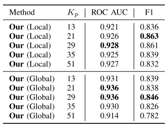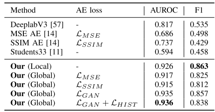 我们针对局部方法和全局方法(LGAN + LHIST 版本)分别研究了不同感受野(receptive field)大小对性能的影响。实验结果(表 II)显示:对于局部方法,感受野为 21 像素 时的 F1 分数最高;对于全局方法,最佳感受野为 29 像素。因此,我们在最终评估中分别采用了这两个感受野设置。这一实验进一步验证了我们关于“适度限制感受野有助于避免过度依赖全局上下文,从而提高异常检测效果”的假设。