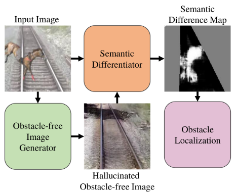 模型流程:首先接收一张包含铁路轨道及其可能障碍物的输入图像,随后利用一个精心设计的语义差异器(Semantic Differentiator),该网络通过比较输入图像与由无障碍图像生成器(Obstacle - free Image Generator)所创建的幻觉无障碍图像(Hallucinated Obstacle - free Image)之间的像素级语义差异,生成一个精细的语义差异图(Semantic Difference Map),此图能够突出显示两幅图像在语义上的不同之处,进而通过计算密度图和应用阈值处理技术,系统能够准确地在语义差异图上定位出潜在的障碍物区域,这一流程结合了局部信息(通过有限感受野的网络设计来限制全局信息的干扰)和全局信息(通过幻觉无障碍图像的生成和比较来引入),从而在无需真实障碍物样本训练的情况下,实现了对铁路轨道上未知障碍物的有效检测。