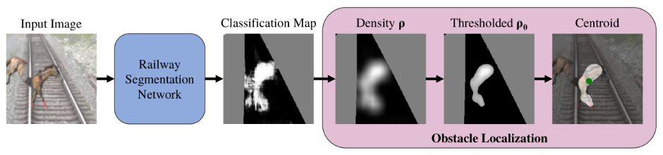 模型流程:首先,输入一张可能包含障碍物的铁路图像,将其输入到铁路分割网络(Railway Segmentation Network)中,该网络通过对铁路轨道特征的识别与学习,精准分割出铁路轨道区域,并生成分类图(Classification Map),明确区分轨道与背景;接着,在分类图的基础上进行障碍物定位,先计算密度图,它依据局部区域的特征信息,反映出各区域存在障碍物的可能性大小;随后进行阈值处理,设定合适阈值将密度图中可能性较高的区域提取出来,形成阈值图;最后通过计算质心,精确确定障碍物在图像中的位置,从而实现对铁路轨道上障碍物的有效检测。