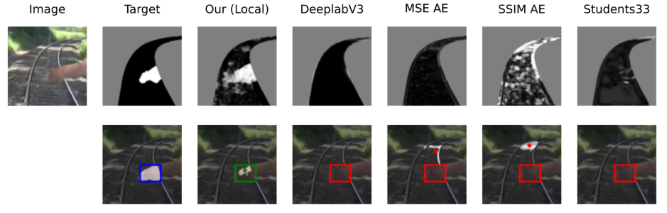 从下图中也可以看到,我们的方法能够准确检测到障碍物,而基线模型往往漏检或误判。尤其值得注意的是,DeeplabV3 虽然结构复杂、感受野大,但其性能明显不如我们的局部方法。这验证了我们提出的假设:过大的感受野导致模型过度依赖全局信息,从而出现过度自信的错误判断。进一步分析发现,DeeplabV3 在训练中从未见过带障碍物的铁路图像,因此倾向于错误地将轨道间的区域都归为“铁路”,对小型或颜色与轨道相近的障碍物尤其容易误判。此外,基于重建的 MSE AE 和 SSIM AE 在障碍物较小或颜色相似时也表现较差,其中 SSIM AE 在结构和对比度明显的障碍物上稍有优势。Student-Teacher 方法(Students33)则在所有模型中表现最差,因为它原本是为结构和颜色变化极小的工业图像设计的,难以应对铁路场景中的多样性。