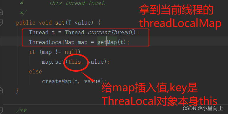 ThreadLocal.set方法,就是 获取当前线程的 threadLocals变量 (ThreadLocalMap类型) , 给该变量put值,key为ThreadLocal对象本身