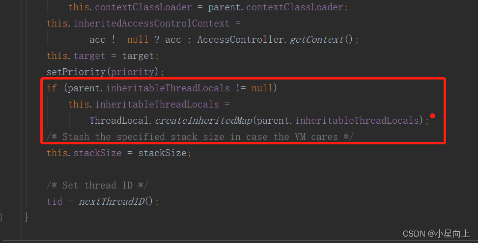 inheritableThreadLocals值,如果不为空,就把值赋值给我new的线程,这样的话,new的线程对象里面也有该变量的值了,完成了threadLocal的传递