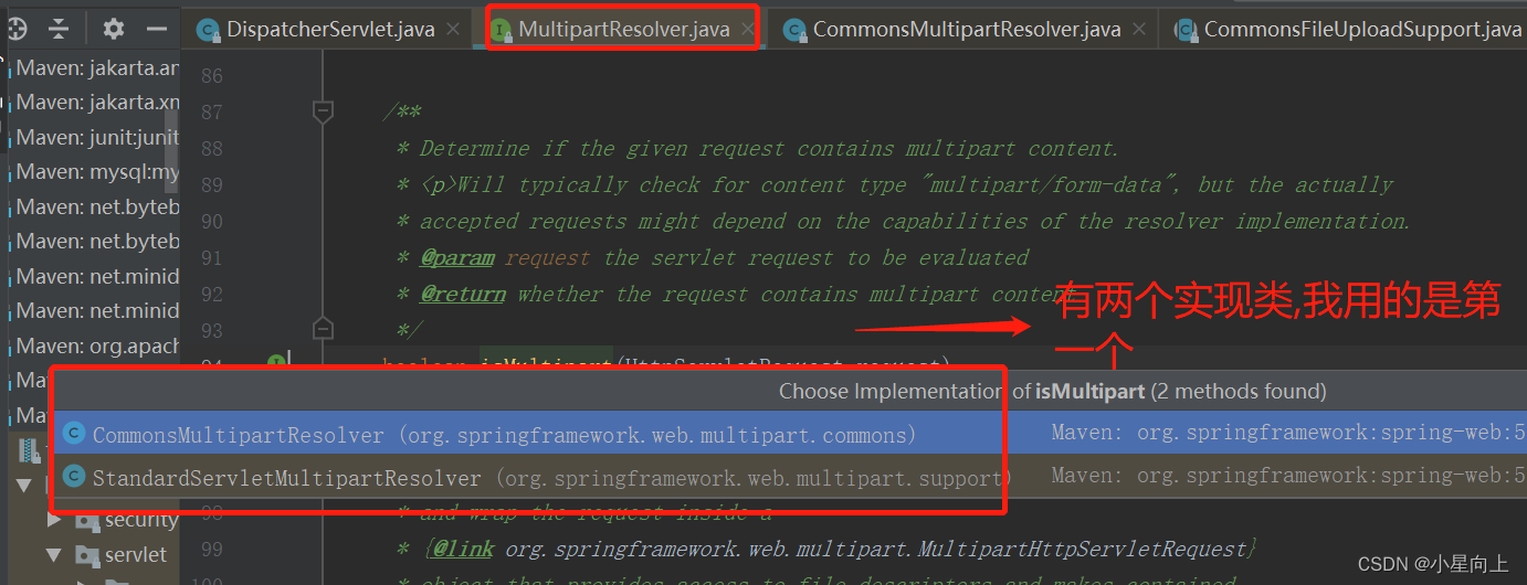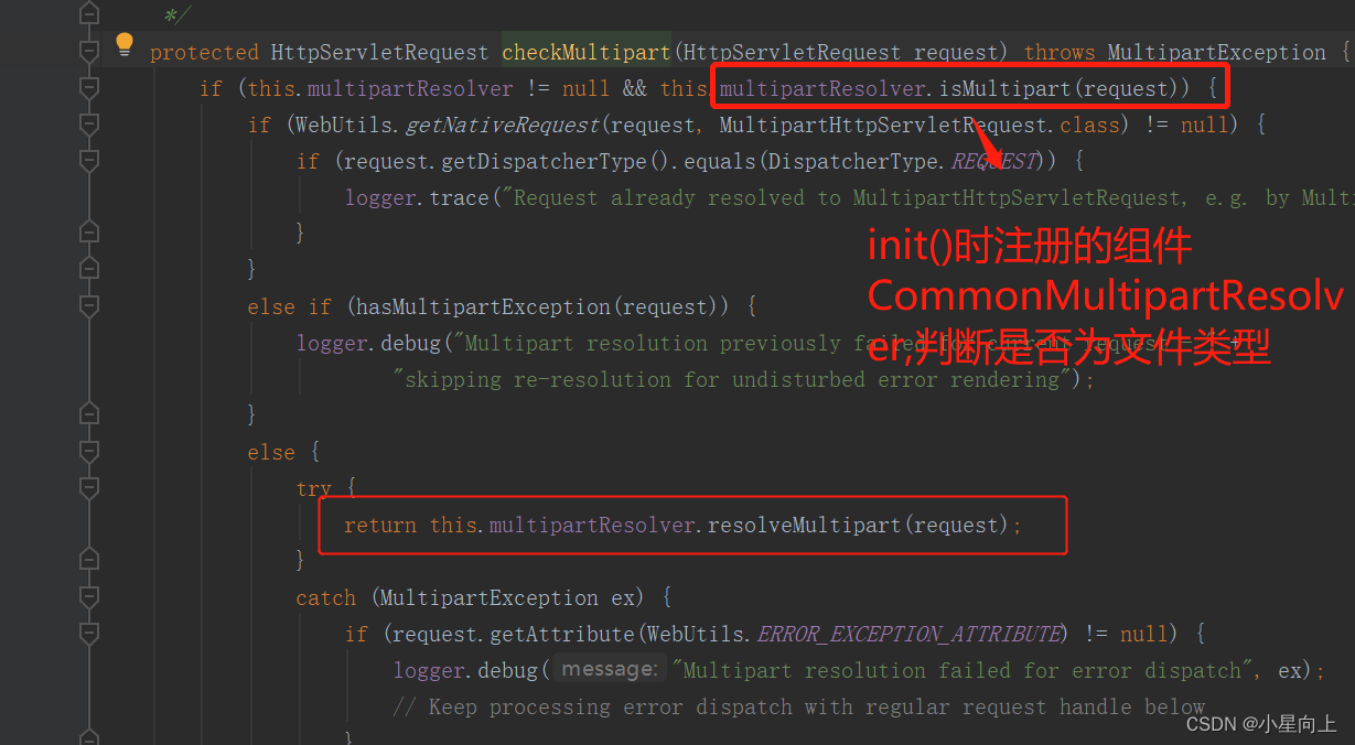 第二个判断:会调用isMultipart,判断请求是否是文件类型,这里我在spring中注册的是第一个,后续都是使用的是该bean里面的方法,不在赘述