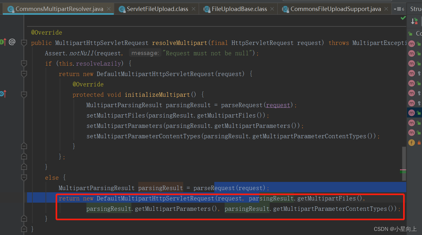 MultipartParsingResult对象 , 设置到DefaultMultipartHttpServletRequest的属性中,返回
