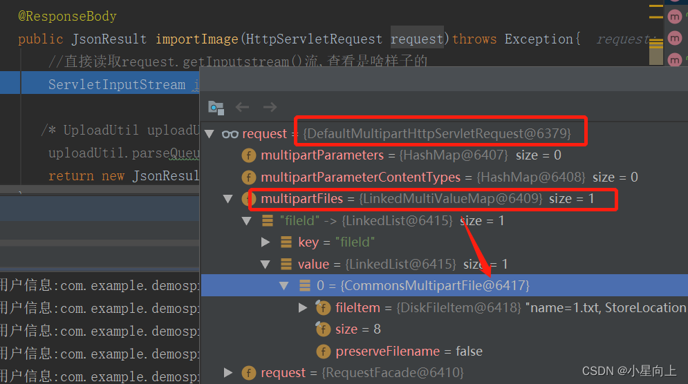 调用方法,查看请求:里面的request确实是 DefaultMultipartHttpServletRequest,multipaerFiles属性中就是上传的文件流信息
