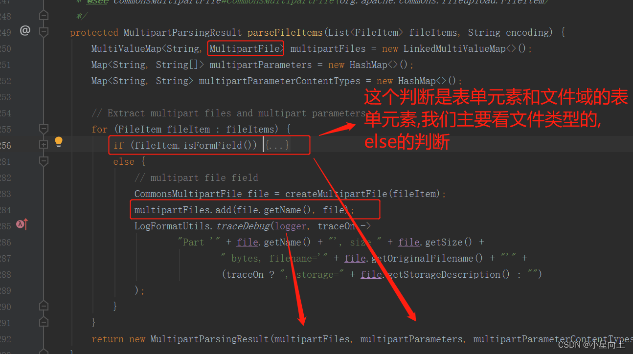 这个就不用说的,调用上传组件解析我们的请求里面的文件,为啥这里是list呢,可能表单中有多个项:普通的输入性\上传的文件项 。每一个File Item对应表单中每一个输入项。文件上传HTTP传过来的数据是比较特殊的(MIME协议),数据格式是会进行拼接的,所以要使用上传组件进行分割。