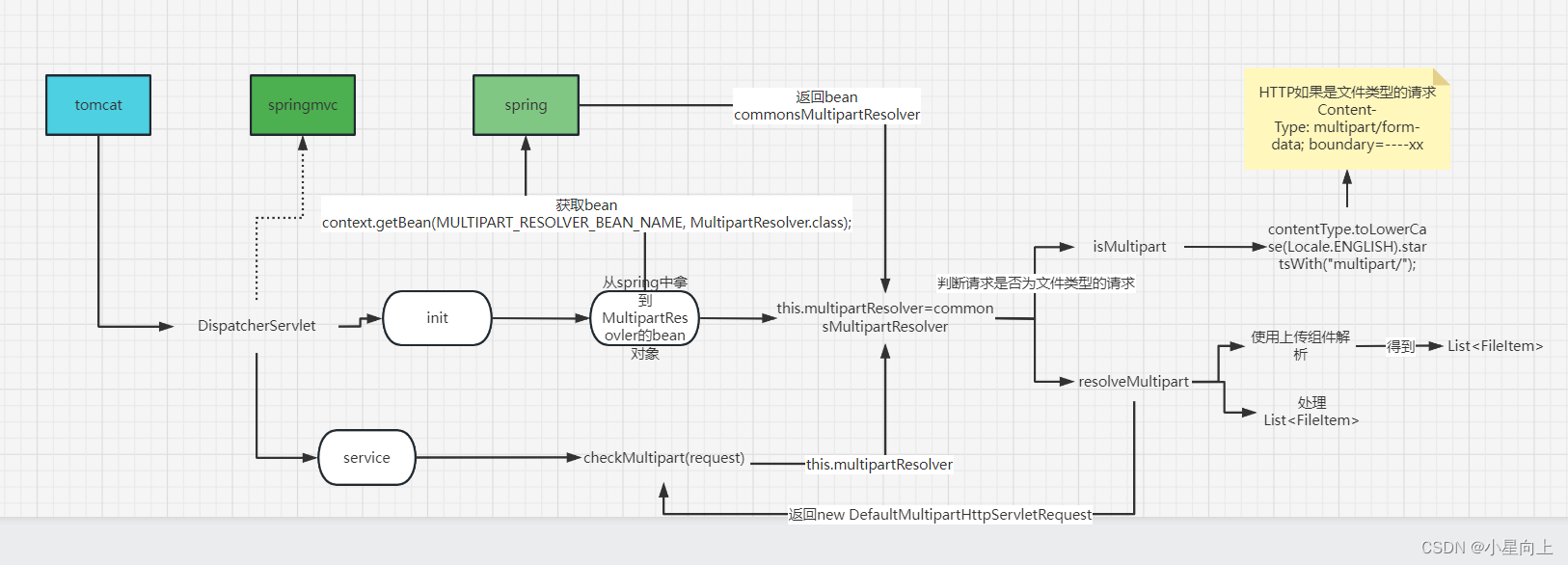 本文介绍了在SpringMVC中处理文件上传的流程,从DispatcherServlet的生命周期开始,详细讲解了如何从HTTP请求转换为MultipartFile,涉及到Servlet的init(),service()方法,以及MultipartResolver的角色。文章还阐述了文件解析的过程,包括解析请求体中的数据并将其转化为MultipartParsingResult,最终存储在DefaultMultipartHttpServletRequest中。