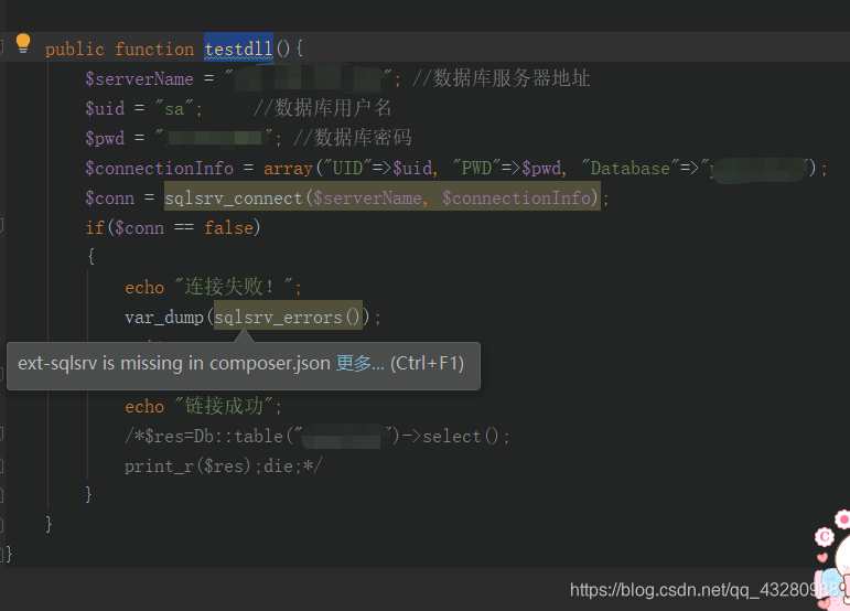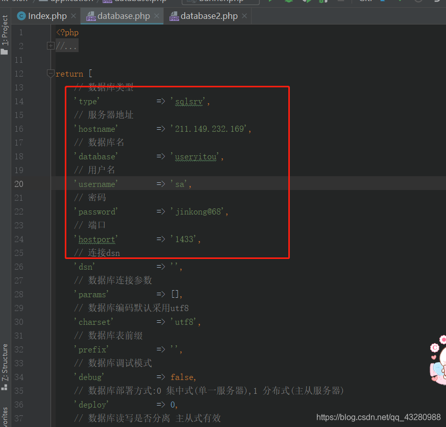 打开tp5的代码中的database.php配置sqlserver数据库连接