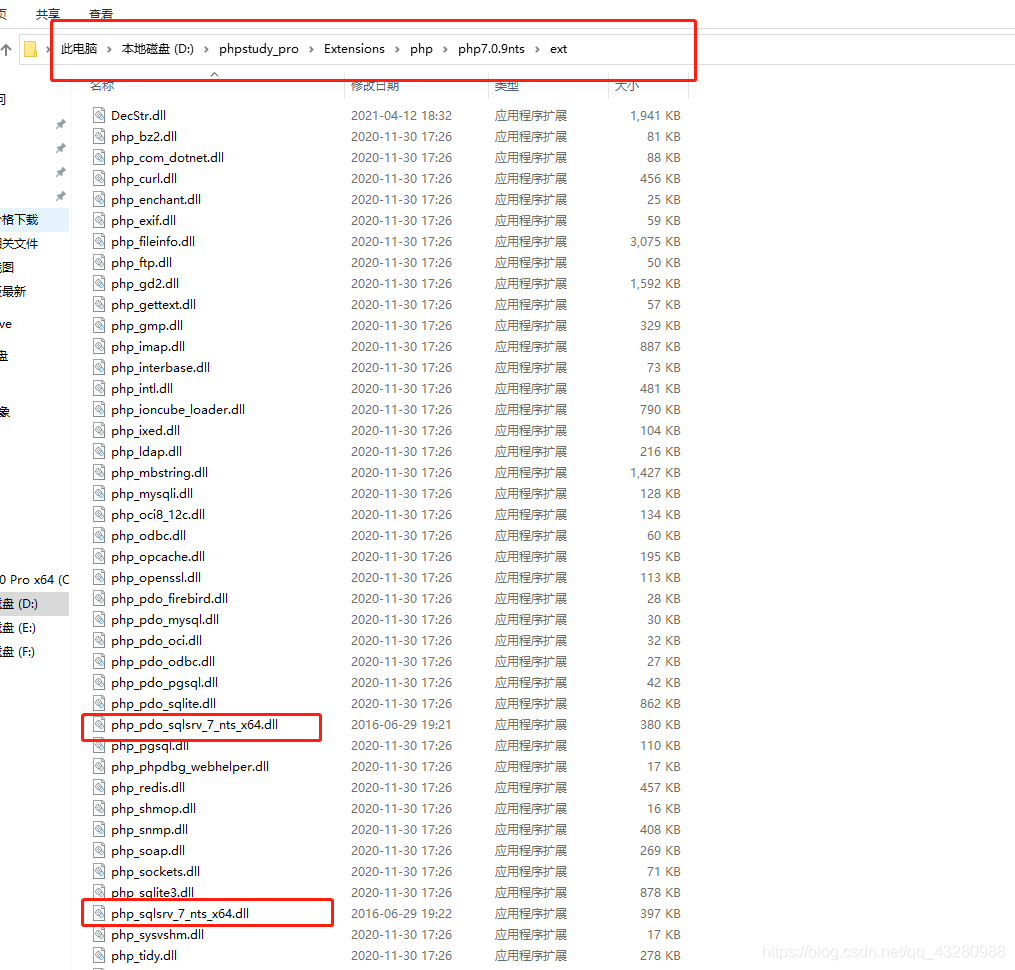 将这两个文件复制出来放入php7.0的目录下:路径: D:\phpstudy_pro\Extensions\php\php7.0.9nts\ext 自己的电脑请按照此路径寻找