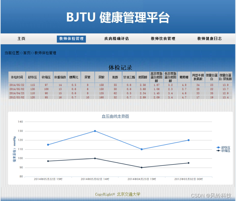 教师可通过该平台查询每次的体检结果,显示部分项目随时间变化的曲线