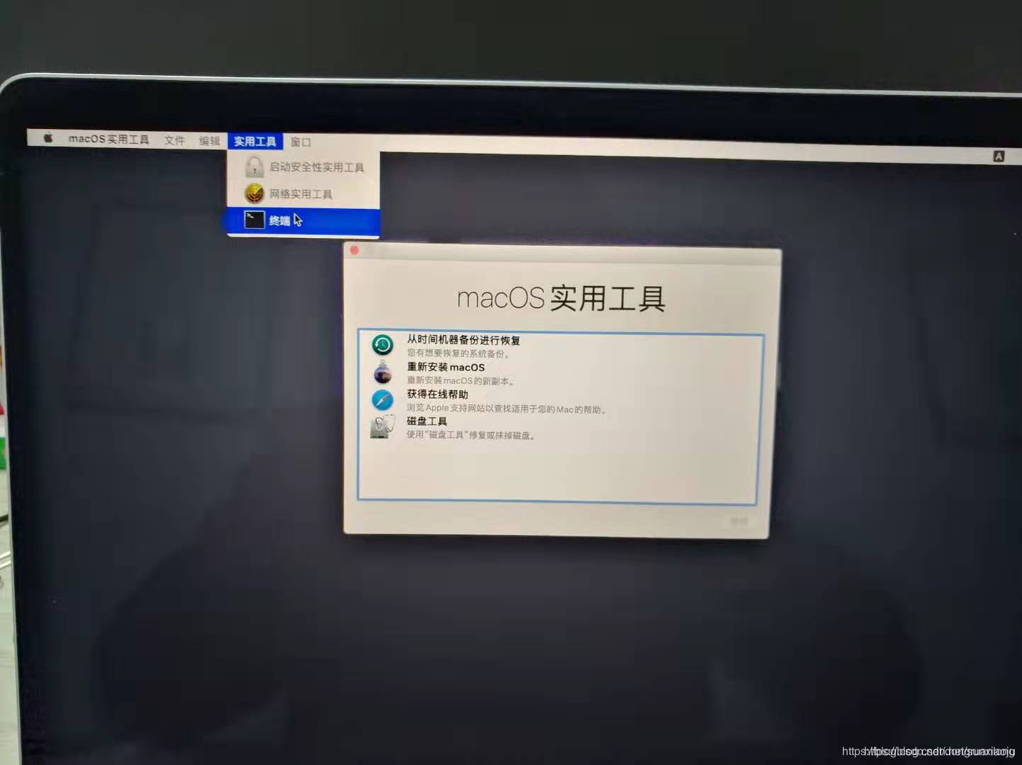 1.进入电脑恢复模式:重启按住 Command+R 进入恢复模式 打开Terminal(终端)