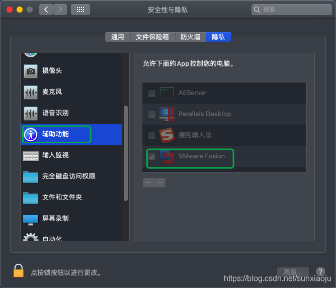 第一步:需要在“设置”-“安全与隐私”中设置:“辅助功能”和“屏幕录制”中都添加“VMvare Fusion”。
