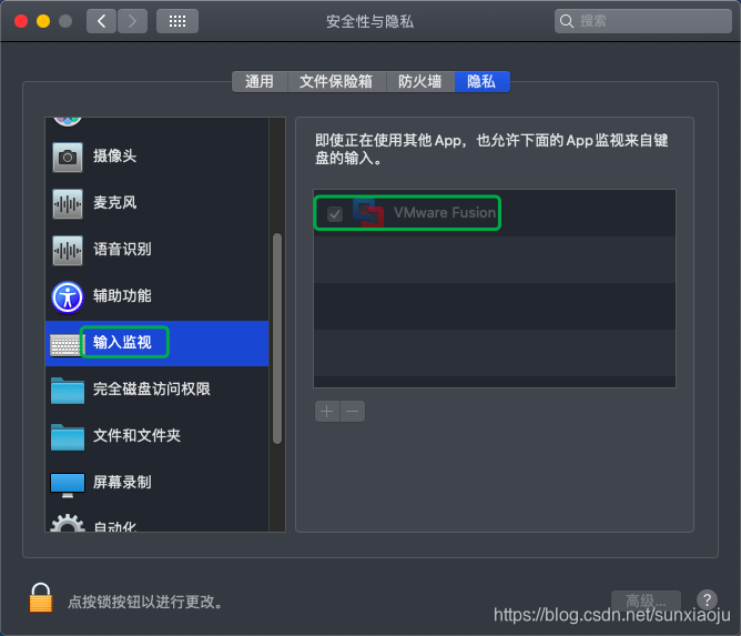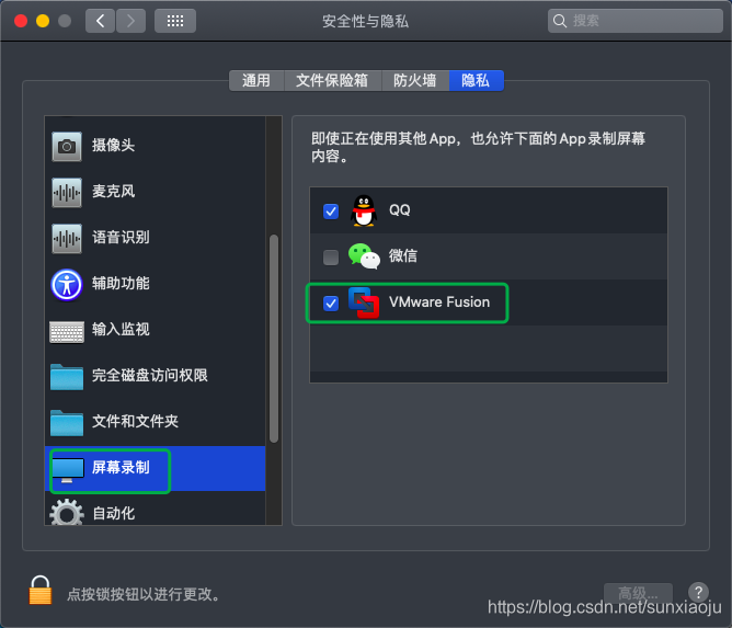 三、完美解决vmware黑屏步骤。需要添加vmware允许屏幕录制的权限。
