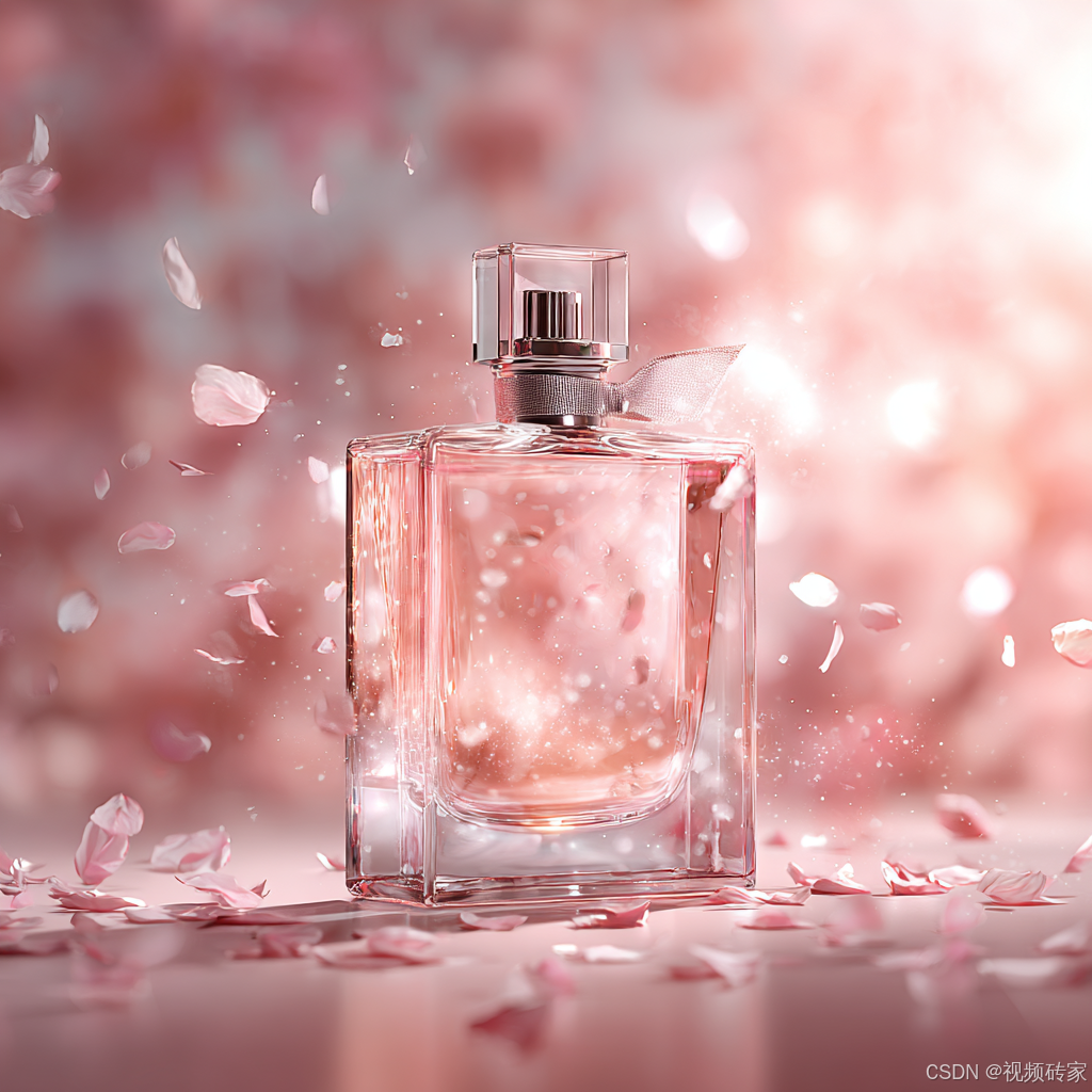 The transparent light pink square perfume bottle is sprayed in the air. With the light spot, the background is soft pink, creating a romantic atmosphere. This advertising video is produced in high definition, capturing every detail with a camera-- --v 7.0