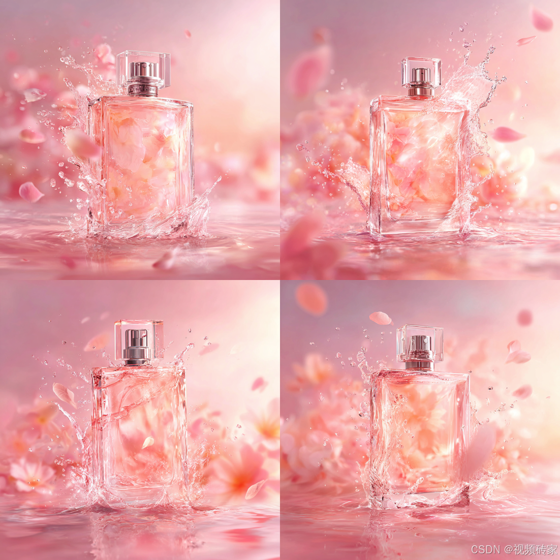 The transparent light pink square perfume bottle sprays water mist in the air. The background is a soft pink color with gentle lighting, creating a romantic atmosphere. This advertising video is produced in high definition, capturing every detail with a camera-- --v 7.0