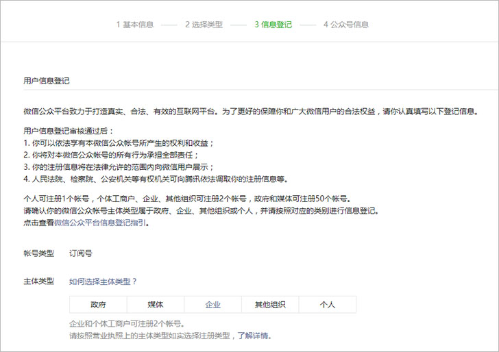 1、若公众号主体注册数量已达到上限,请在注册页面第三步,正确填写主体信息及管理员信息,信息填写完整后点击“继续”提交。