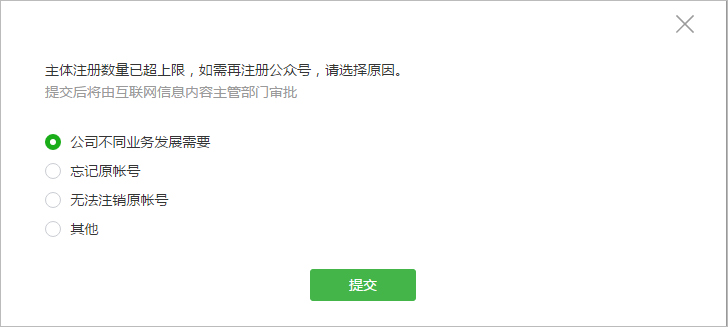 2、系统将进行检测主体是否已达上限,若主体已达上限,页面会有弹窗提示,请根据页面提示选择注册多个帐号的原因,选择完成后点击“提交”,以便提升注册数量。
