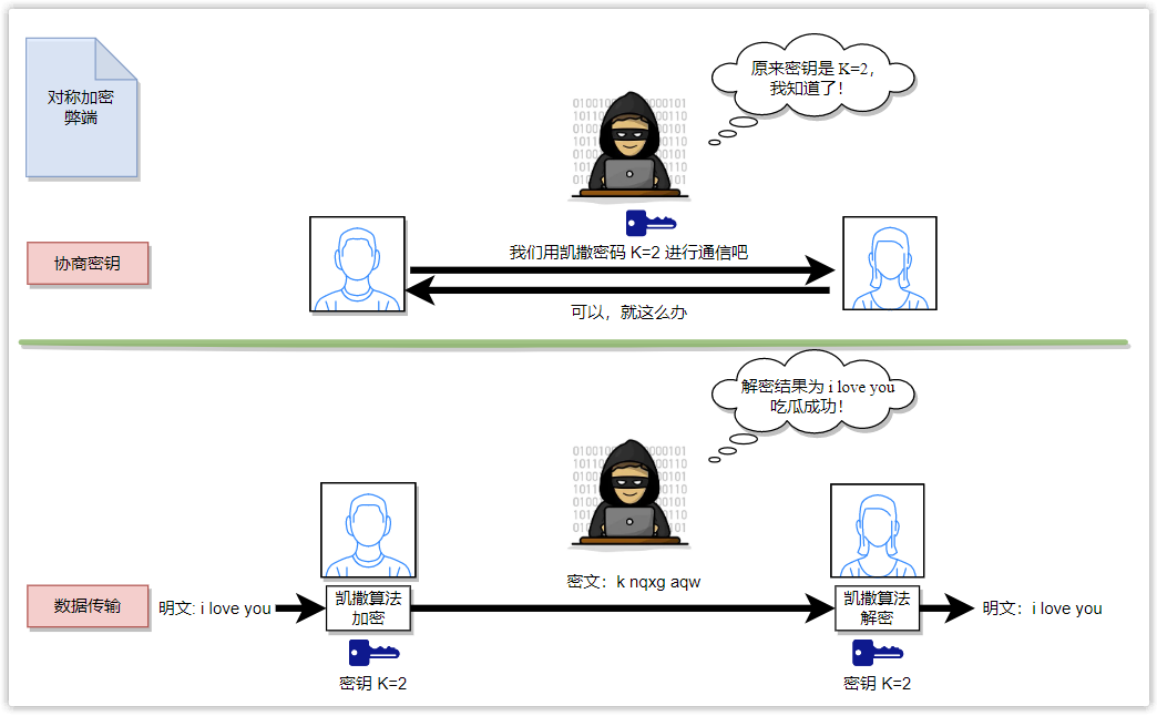 前面提到,对称加密算法需要提前协商出密钥,而协商的过程用的是明文(因为还没有密钥),如果黑客截获了明文密钥,那么之后即使加密了,黑客也可以用密钥进行解密,此时就无安全性可言了!