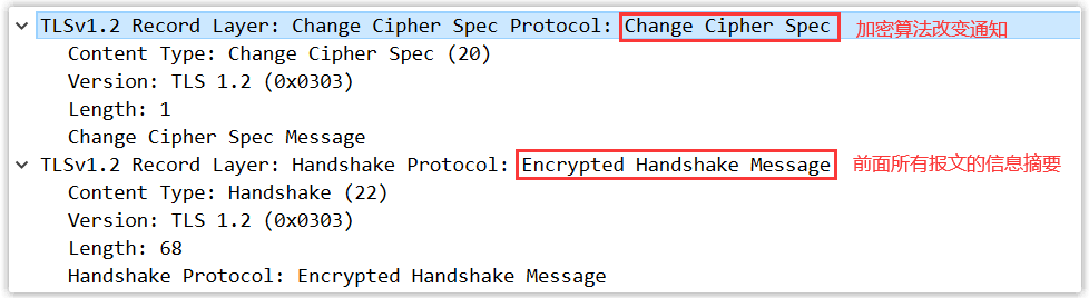 服务器握手结束通知,表示服务器的握手阶段已经结束。服务器会生成所有握手报文数据的摘要,并用会话密钥加密后发送给客户端,用来供客户端校验。