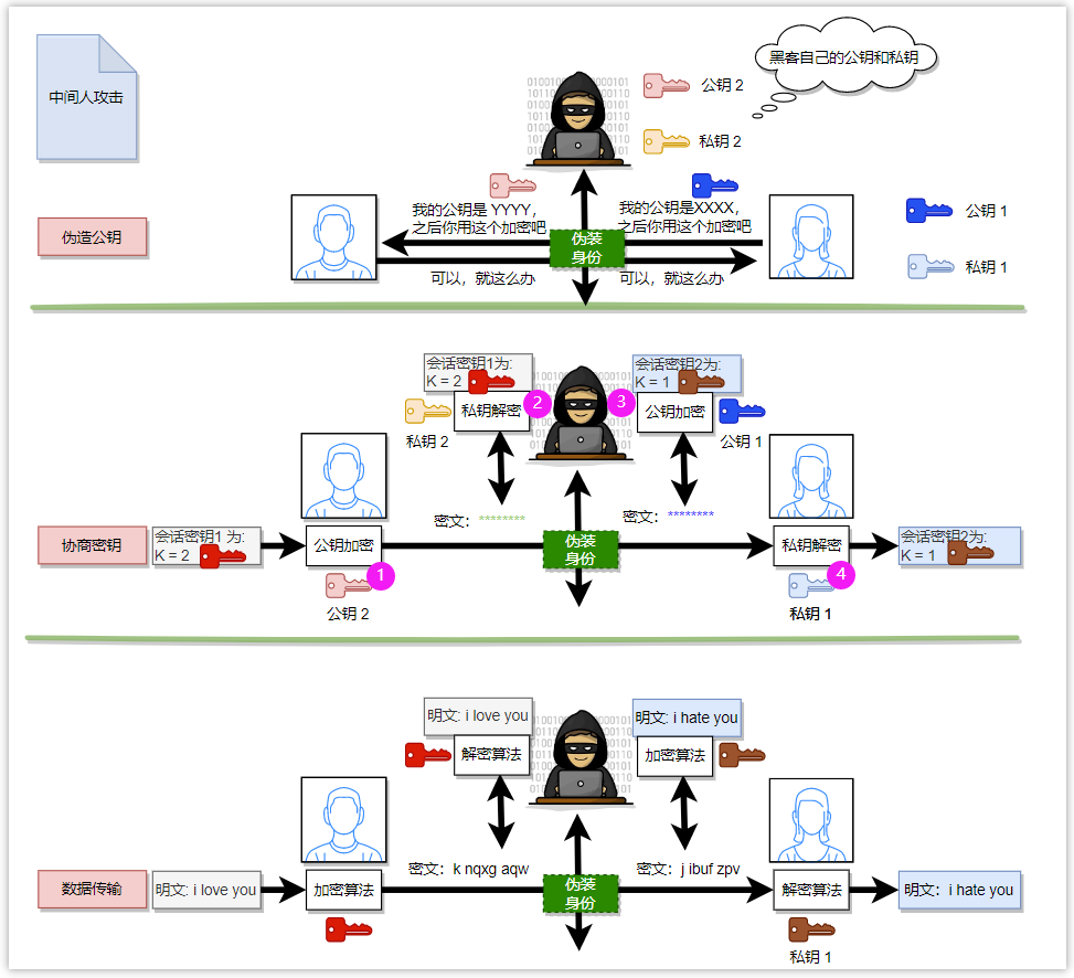 中间人使用自己的私钥 2 解密得到会话密钥1,同时假装自己是客户端,使用正规网站的公钥 1 加密会话密钥2(可以与会话密钥 1 相同)并发送至正规网站。