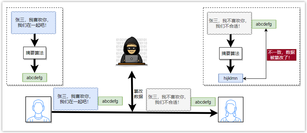 接收方收到数据后,利用同样的摘要算法再次得到数据的摘要,并将其与发送方发送的摘要进行比对校验,如果二者不一致,则说明数据被篡改了,反之则没有。