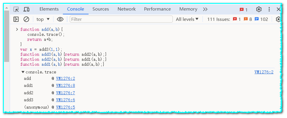 console.trace()堆栈,有时候一个方法会被很多地方调用,但是在运行的过程中没报错但是却没达到我们的预期,我们又不知道是哪里被调用的,这时候就用到了console.trace(),在方法里使用console.trace()就知道是谁调用的了这个方法了