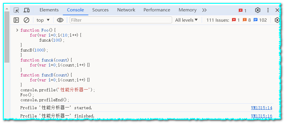 console.profile() 方法用来新建一个性能测试器(profile),它的参数是性能测试器的名字。