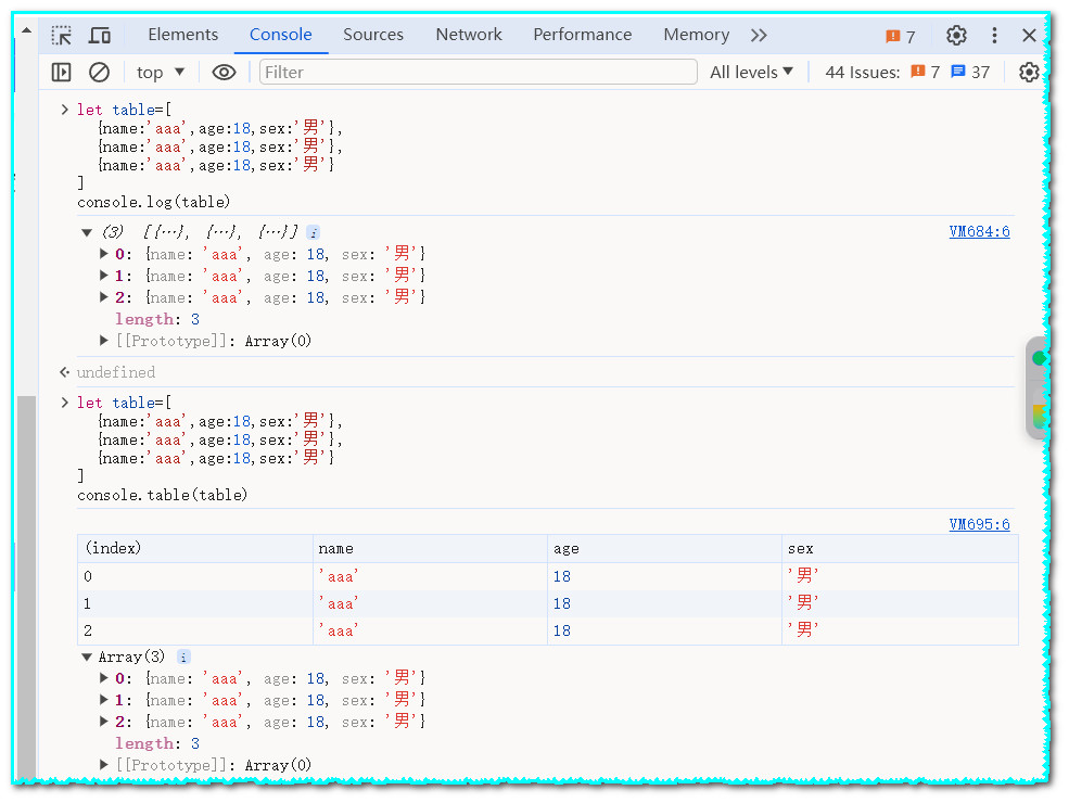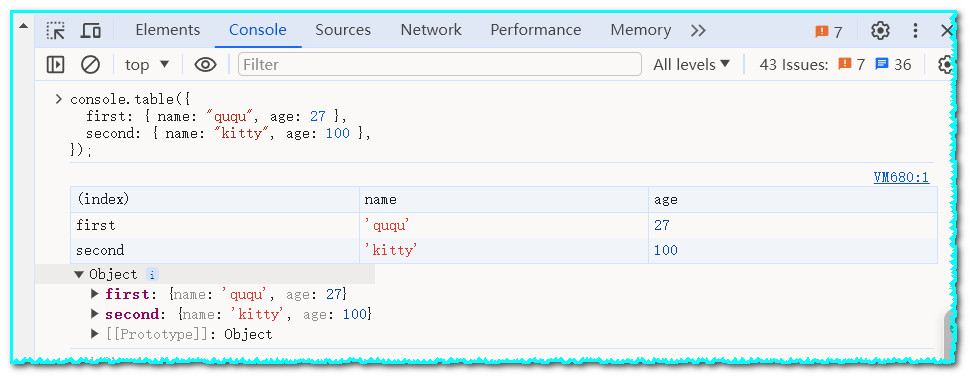 console.log()换成console.table()打印,看上去能更直观得显示数据,而且下面还会列出详情。大家可以通过下面示例,只观感受一下: