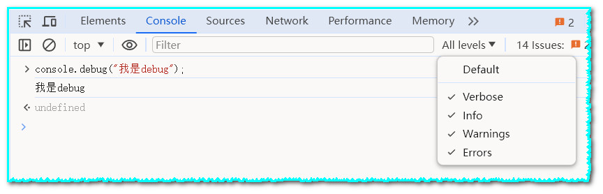 注:浏览器默认情况下,console.debug() 打印输出的信息是不会显示出来的,只有在打开显示级别在verbose的情况下,才会显示。