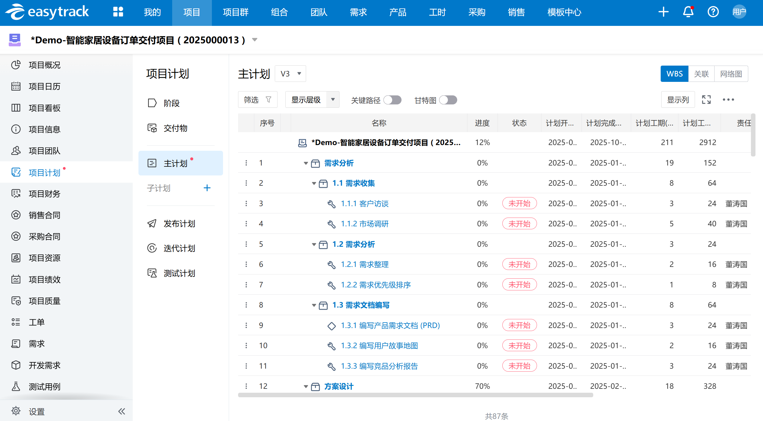 例如,易趋支持两级计划管理,包含阶段计划以及WBS分解计划,确保项目整体进度可控。当项目出现延误时,会通过红黄绿灯示警、提醒处理,确保项目顺利进行。