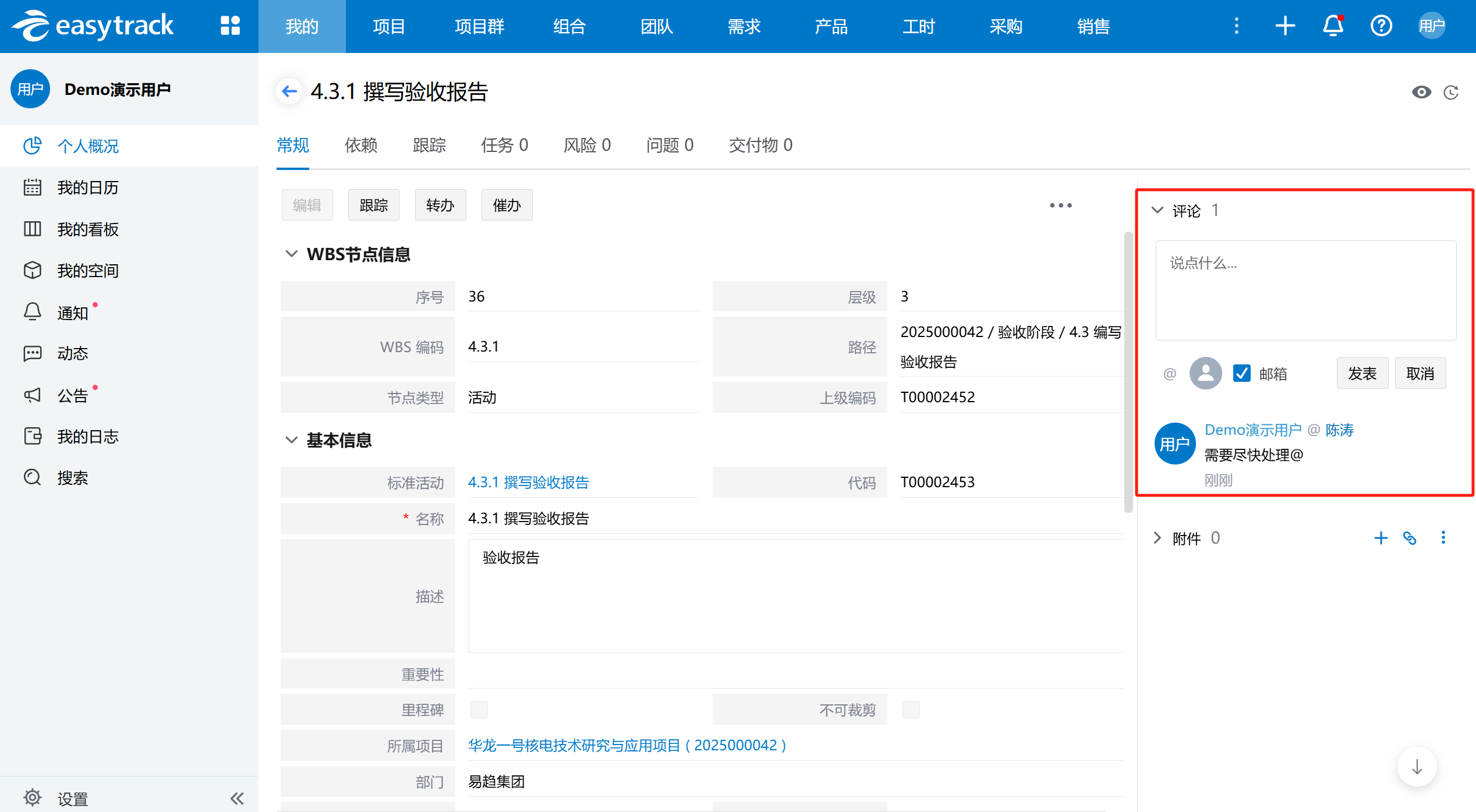 例如,项目经理可以对业务对象例如问题、风险、任务等发布评论,并直接@相关人员;相关人员可在通知以及邮箱内查看相关内容。