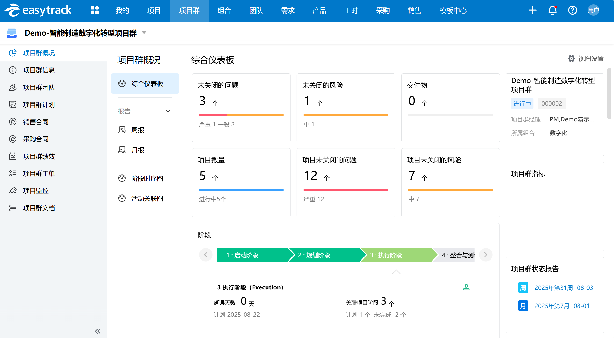 易趋(EasyTrack)是一款专业的项目数字化运营管理平台,专注企业级项目全生命周期管理,聚焦产品研发、交付类、IT/数字化/企业变革项目管理三类核心场景,覆盖敏捷开发、传统瀑布模型及混合式项目管理,融合PMBOK、Prince2、CMMI、IPD、APQP、精益等管理方法论。