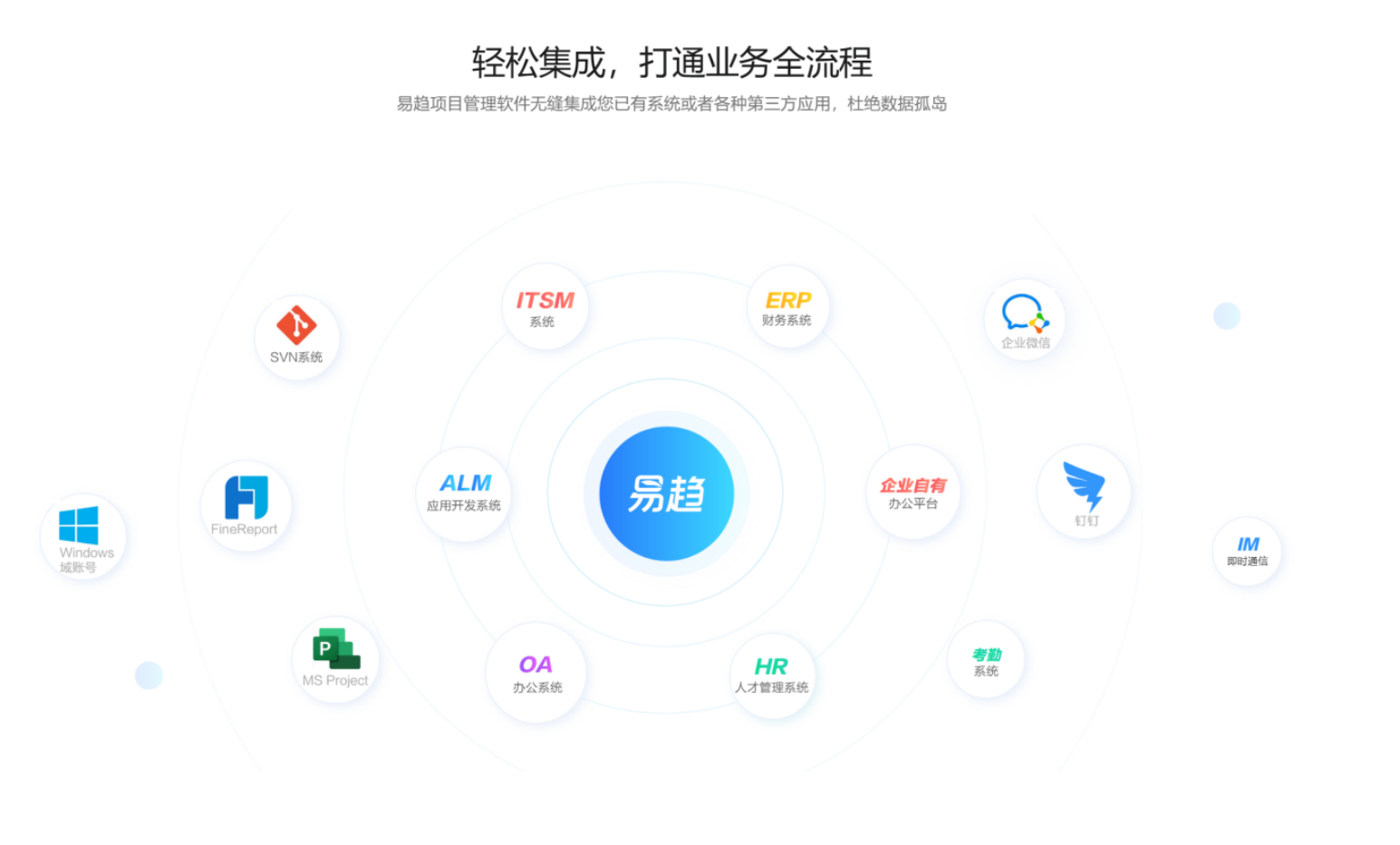 易趋支撑各类项目全生命周期管理:如产品研发、软件开发、IT信息化、合同交付和数字化转型等核心场景;