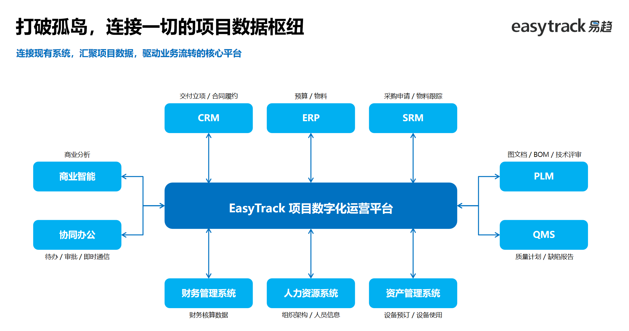 她强调,易趋(EasyTrack)不是替代其它专业系统,而是成为项目管理的中枢神经,通过系统集成打通专业领域,驱动业务运转。