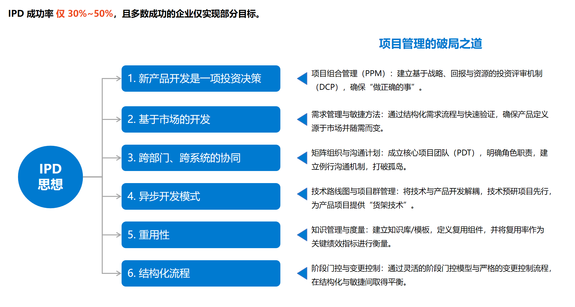 唐智勇先生指出,IPD作为一种先进的产品开发管理模式,虽然被众多企业所采纳,但其成功率却并不理想,多数企业仅实现了部分目标。这主要是因为IPD理念在落地过程中面临着诸多挑战,如跨部门协同困难、需求管理不善、资源分配不合理等。